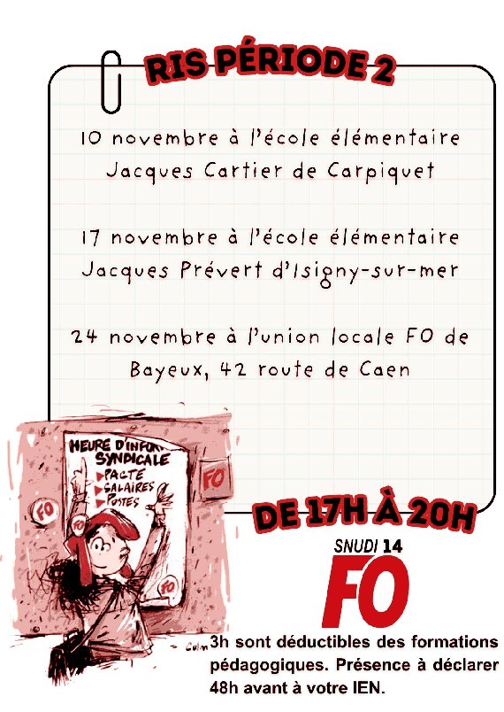 Dans la continuité de ce qui a été mis en place par le SNUDI FO 14 depuis la rentrée 2025-2026, nous vous proposons trois nouvelles Réunions d’Informations Syndicales (RIS) sur le département. Toutes trois seront animées par Kenji, notre délégué syndical.