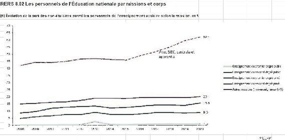 Vous remarquerez également l’ascension fulgurante de la courbe rose des personnels non-titulaires remplissant les missions hors enseignement.